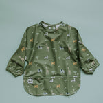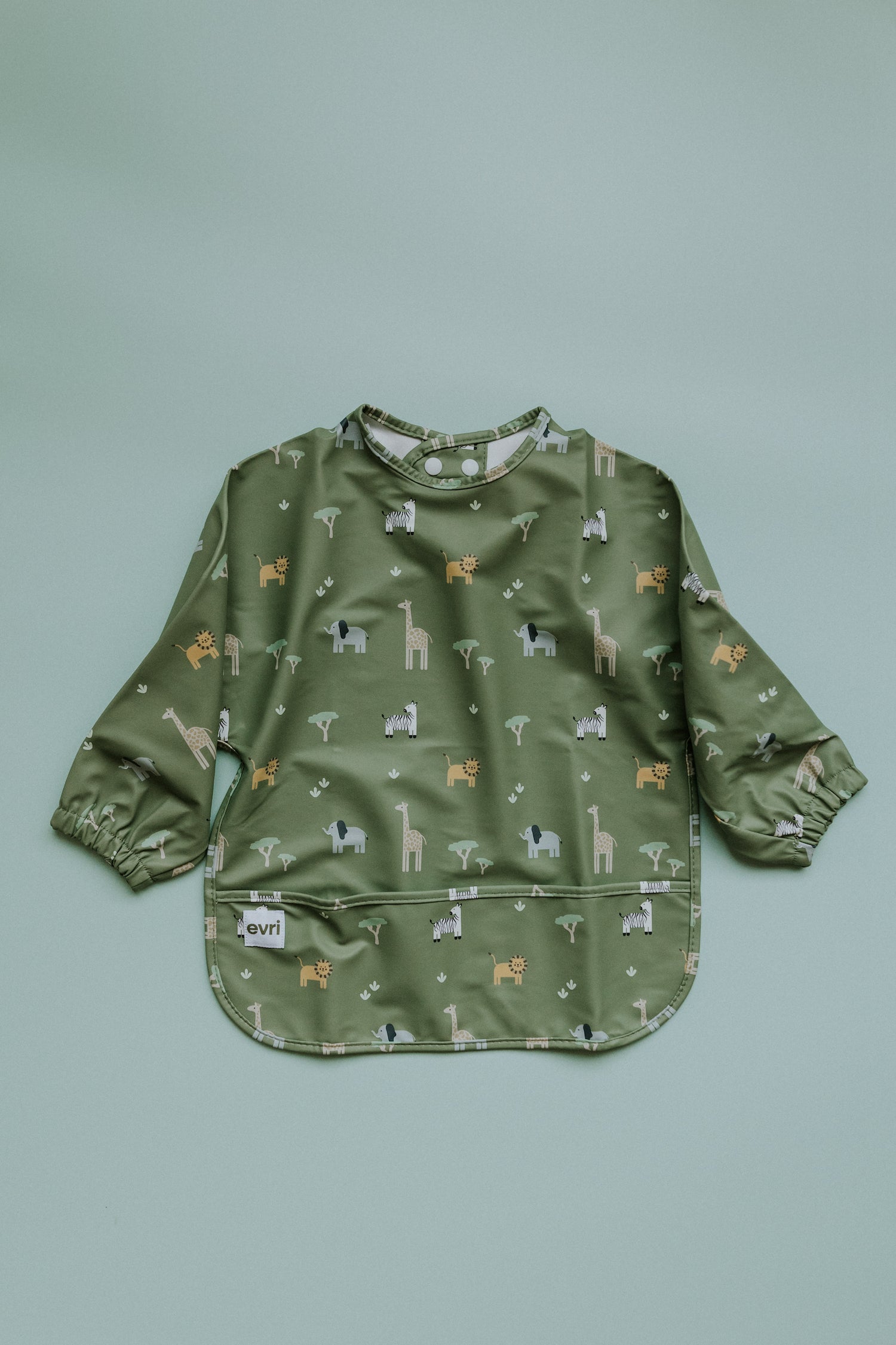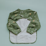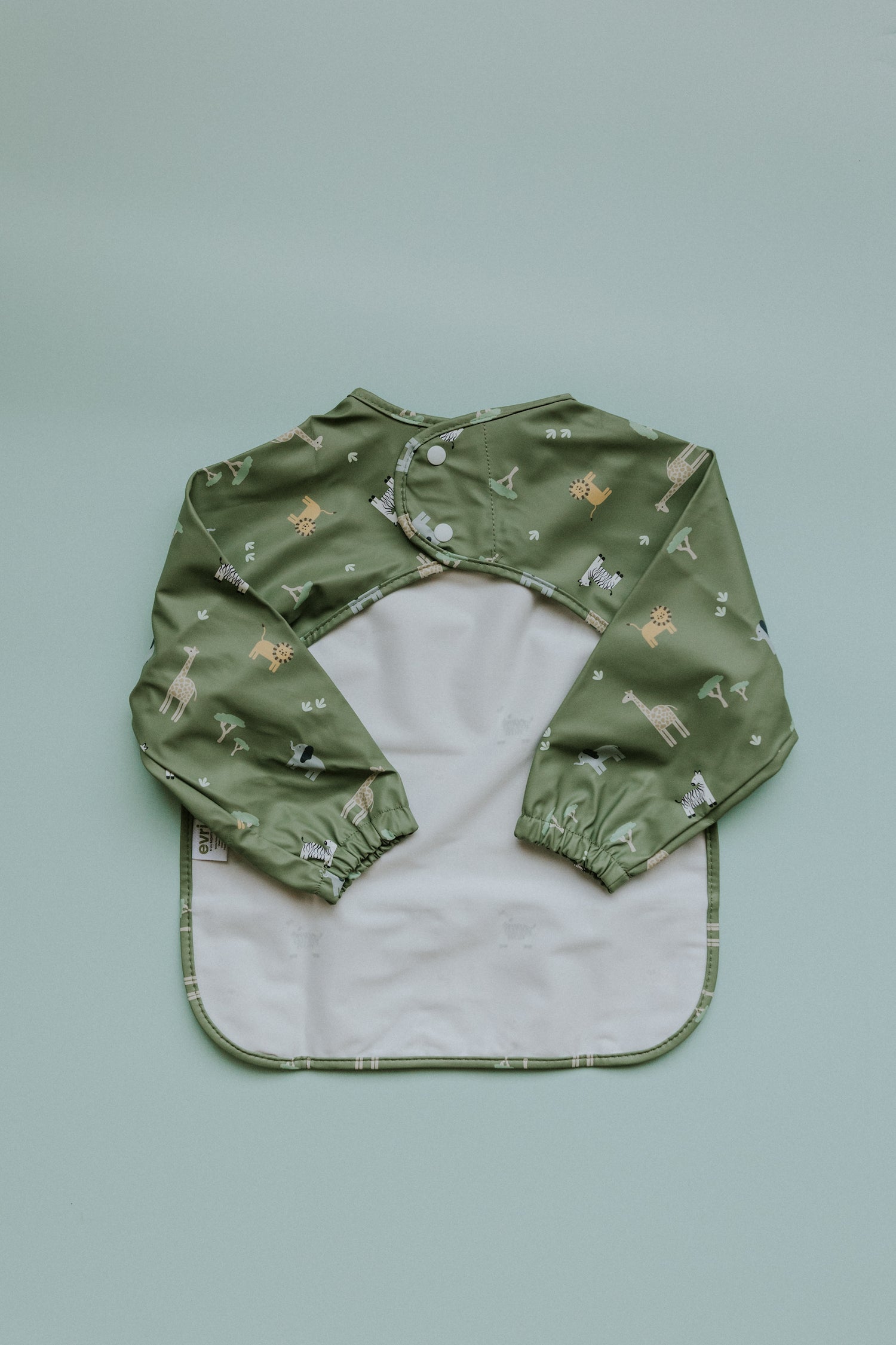 Mealtime just got a whole lot easier with our long-sleeved smock. Designed with generous coverage from neck to lap and wrist to wrist, this smock keeps clothes protected during meals, snacks, art time, and everything in between. Elasticized cuffs prevent sleeves from dragging through food, while the extended front pocket catches spills and crumbs.